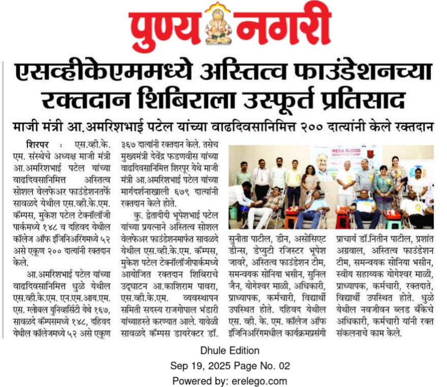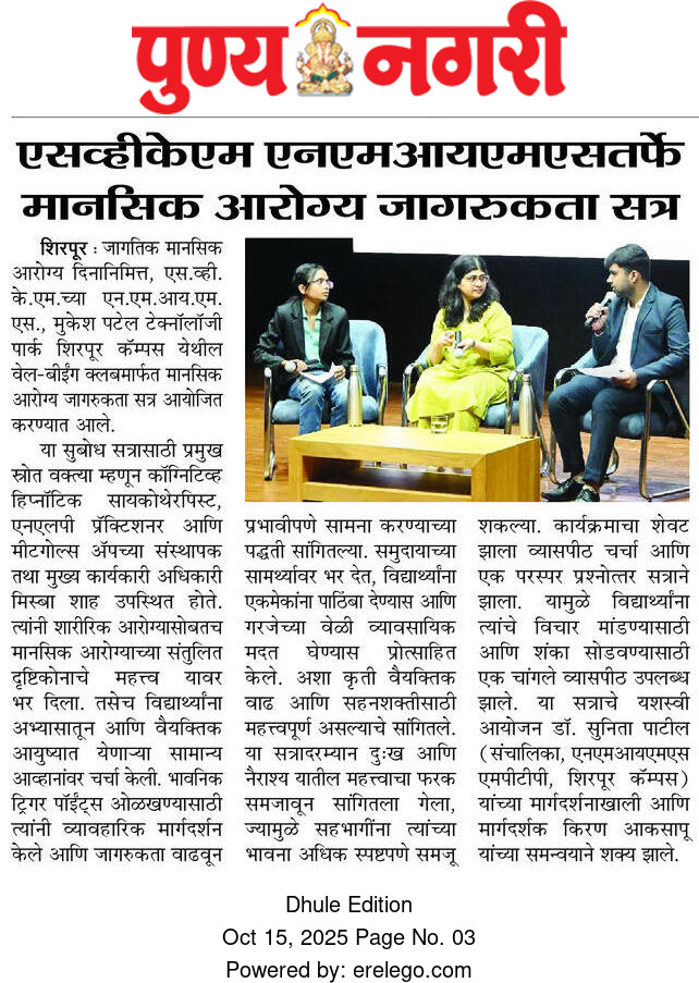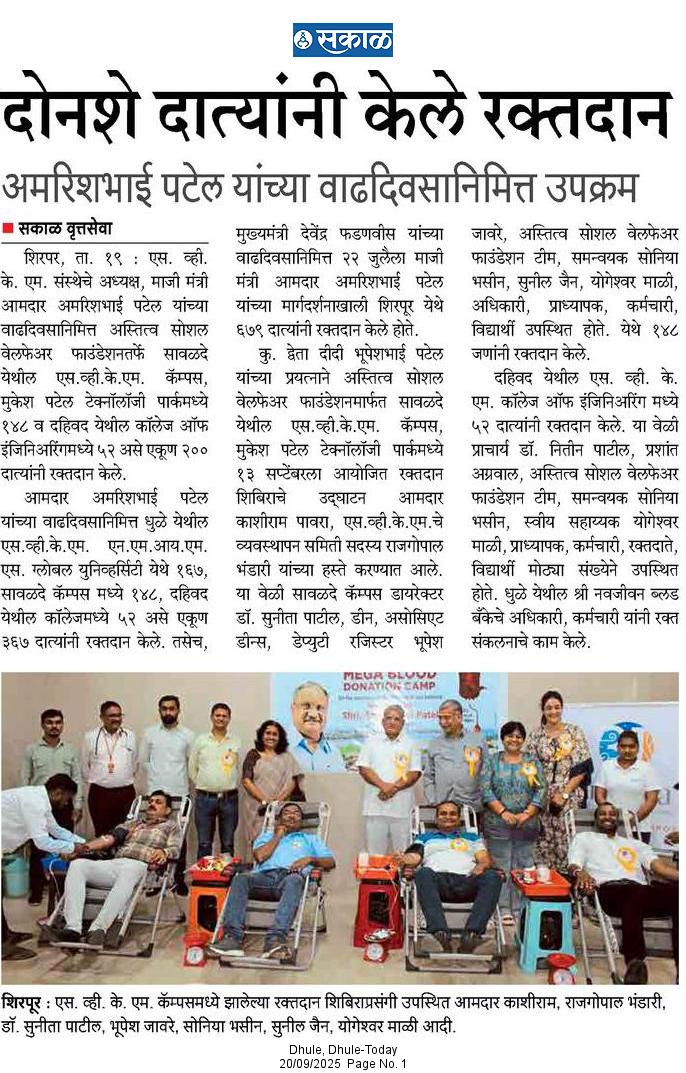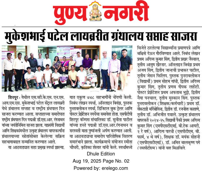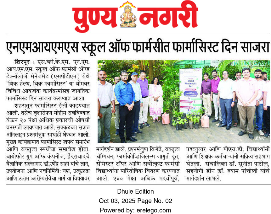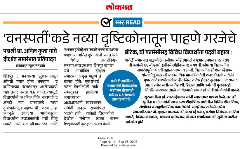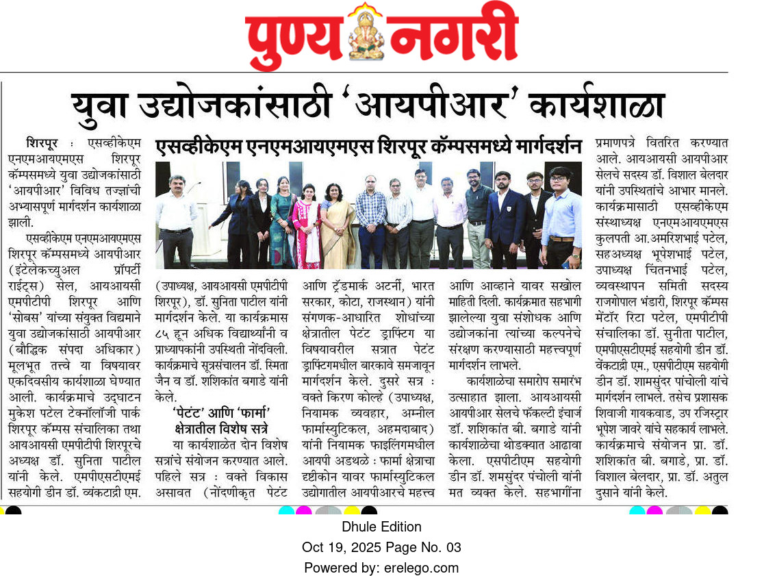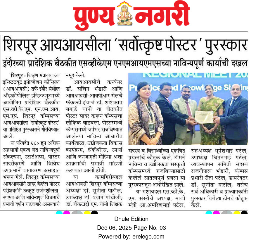 SVKM’s NMIMS, Mukesh Patel Technology Park, Shirpur Campus is an integrated campus approved by the All India Council for Technical Education (AICTE), New Delhi. SVKM’S NMIMS Shirpur Campus is an affiliate of NMIMS (Deemed-to-be University), which has been accredited with A+ Grade by the National Assessment and Accreditation Council (NAAC) and has been recognized as a Tier 1 University by the University Grants Commission (UGC).
